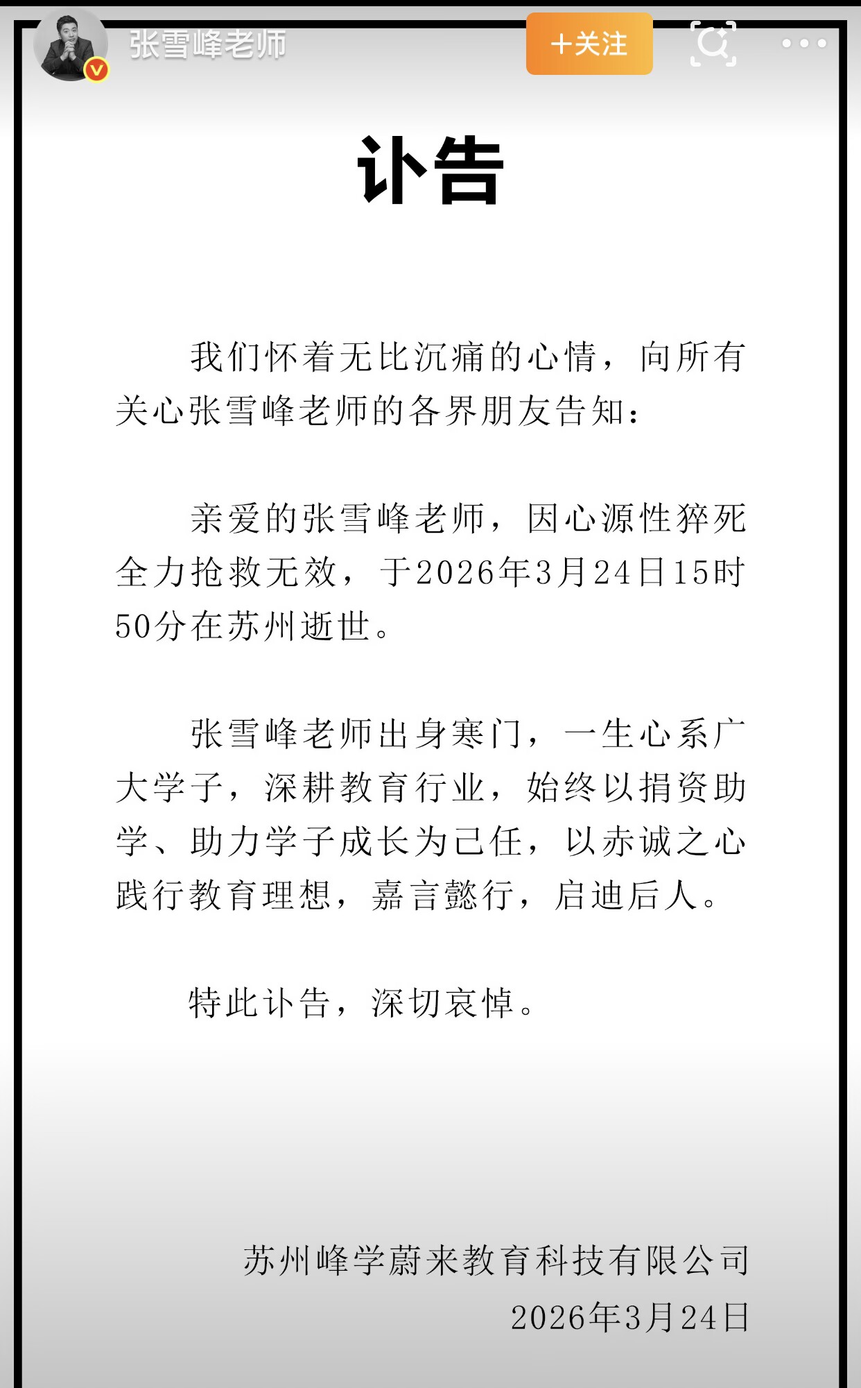 文章首发于公众号:福传读书 嘿,你好朋友,我是邢福传~”张雪峰死了“是的,此消息一出真的是震惊了所有人,包括他的女儿,家人,学生,员工,以及千万广大网友,毕竟他只有41岁,正当年轻力壮,怎么会....