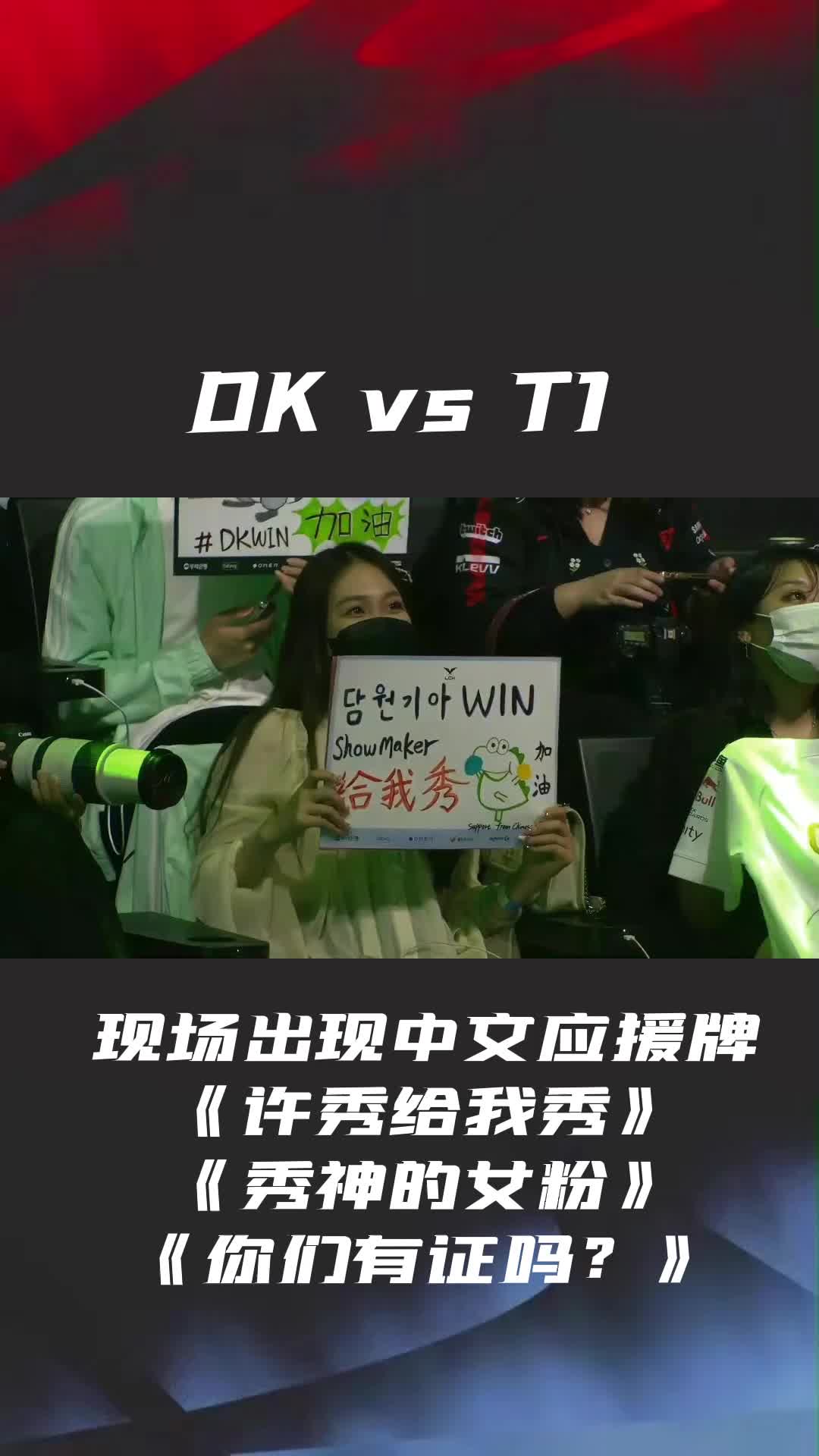 53次播放 | 00:07DK vs T1 现场粉丝写中文应援牌为Showmaker许秀加油,你们有证吗