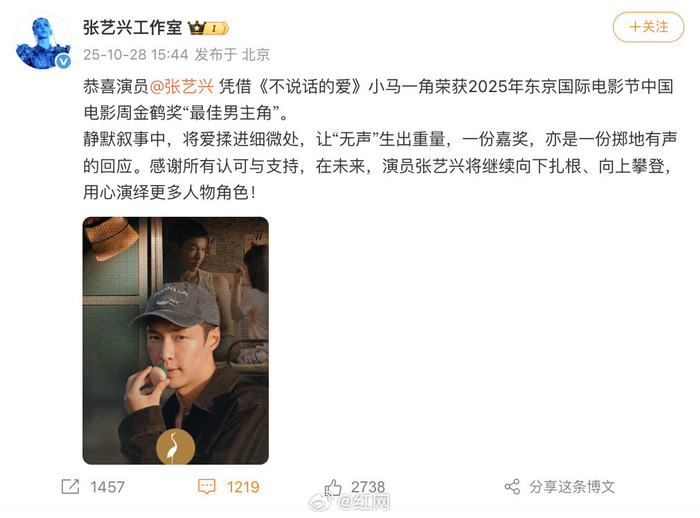 2025年10月28日,第38届东京国际电影节·中国电影周金鹤奖颁奖典礼上,演员张艺兴凭借电影《不说话的爱》中聋人父亲“小马”一角,力压群雄摘得“最佳男主角”桂冠。同时,该片也凭借深刻的社会议题与情感
