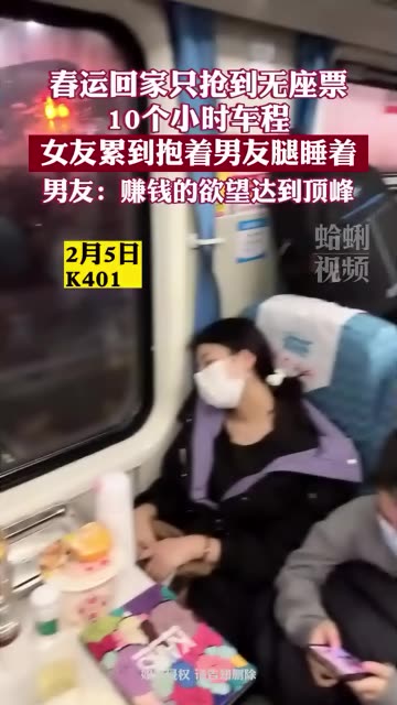 • 春运回家只抢到无座票 10个小时车程 女友累到抱着男友腿睡着