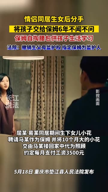 保姆在情侣分手后代养孩子6年,因担心孩子上学没户口起诉情侣,法院:撤销生父母监护人资格。