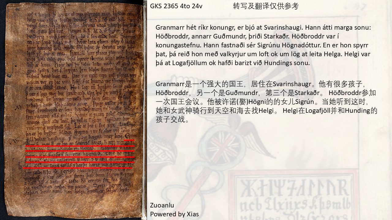 上一部分我们讲到了Helgi和Sigrún的相遇。这一部分我们继续讲他们之间的故事。这里以散文的形式介绍了Höðbroddr,即和Sigrún订婚的人的身世。Helgi在战斗中杀死了Hunding的四