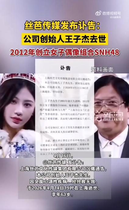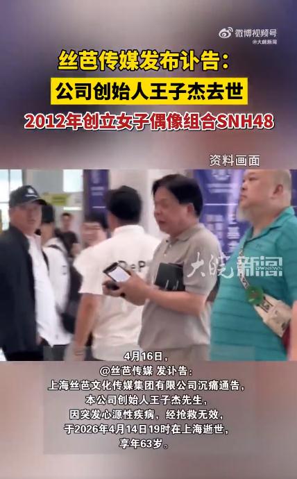 2026 年 4 月 16 日,上海丝芭文化传媒集团发布讣告,创始人、总裁王子杰先生因突发心源性疾病,经全力抢救无效,于 4 月 14 日 19 时在上海与世长辞,享年 63 岁。一、从游戏巨头到偶像