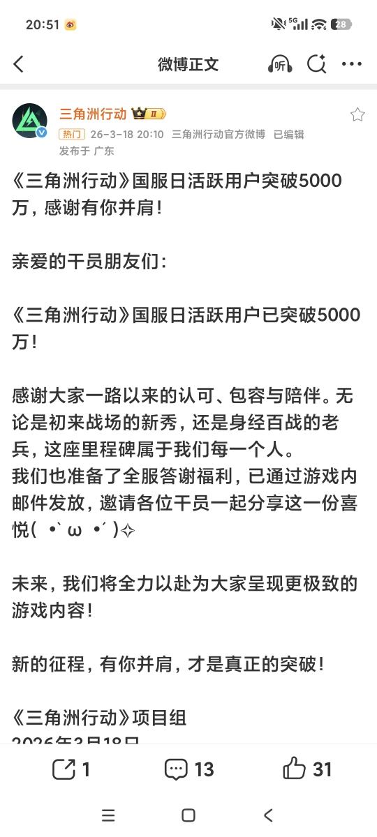 1953次播放 | 08:30腾讯《三角洲行动》国服日活用户突破5000万