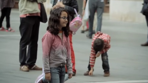 当女孩把一个硬币给了街头艺术家后得到的惊喜