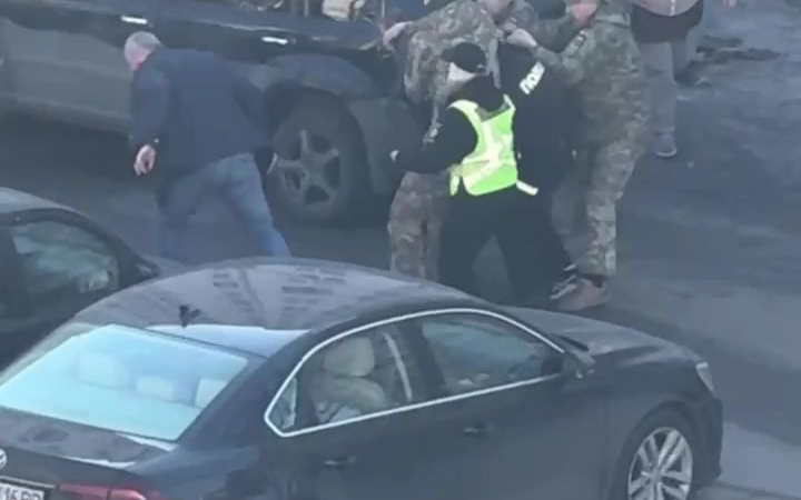 乌克兰斩杀线,三个征兵员负责抓人上车,警方负责用辣椒喷雾驱逐好心人帮忙。