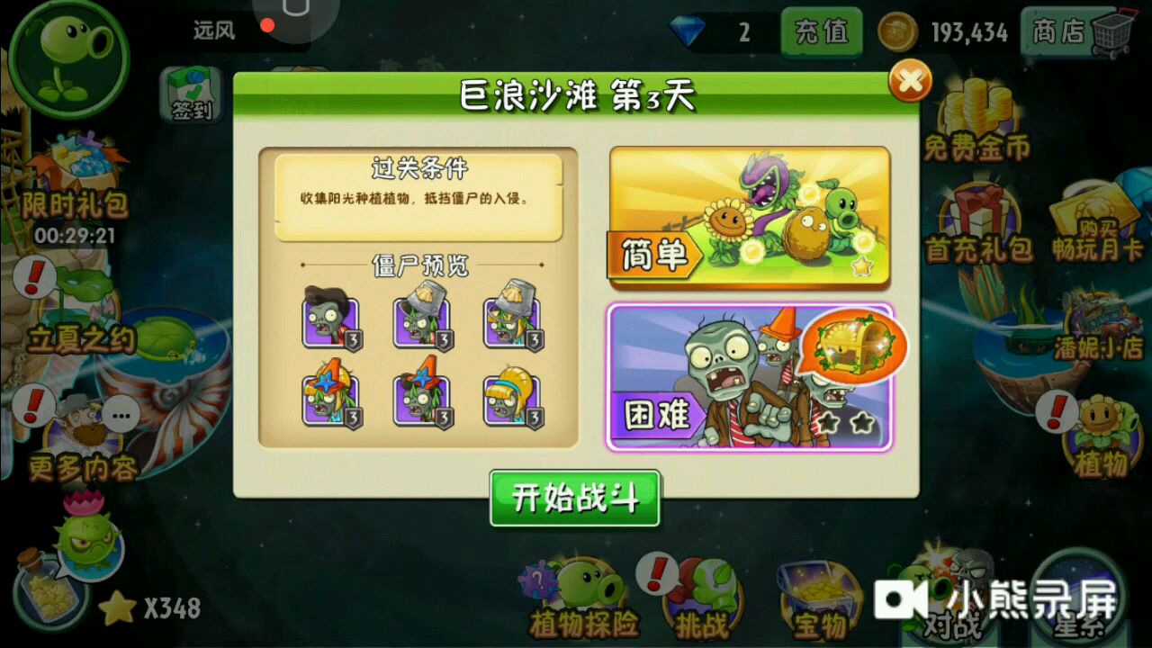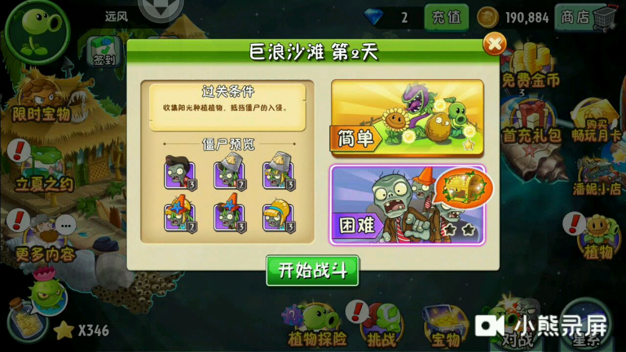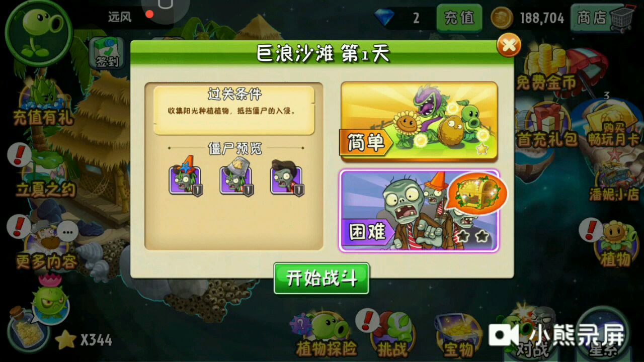 植物大战僵尸二 巨浪沙滩 第一天 困难