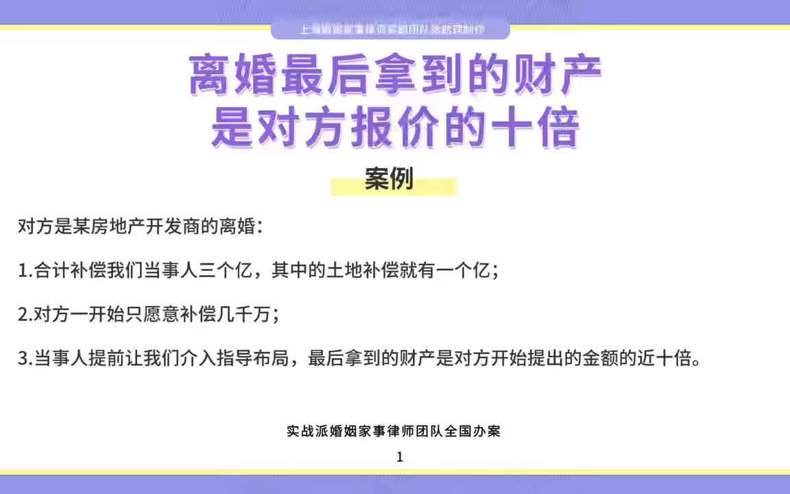 上海婚姻家事律师梁聪律师团队原创:离婚最后拿到的财产是对方报价的十倍