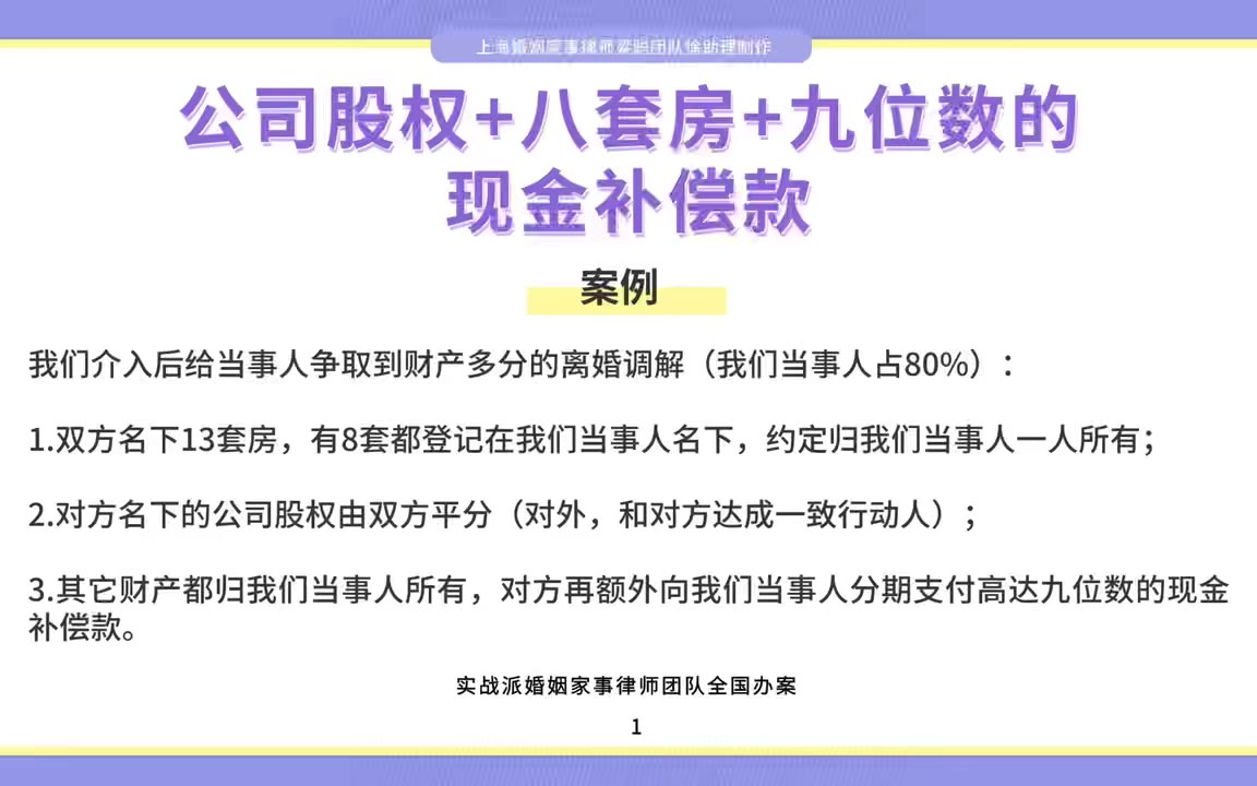 上海离婚律师梁聪律师:公司股权+八套房+九位数的现金补偿款