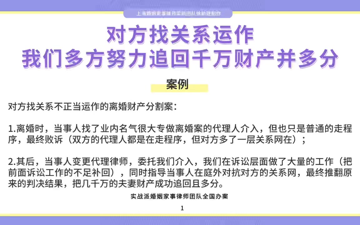 上海婚姻家事律师梁聪团队原创:对方找关系运作,我们多方努力追回千万财产并多分
