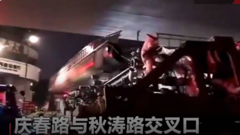 货车载物超高还硬闯 杭州一人行天桥瞬间被撞塌