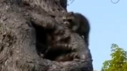 浣熊妈妈带着一窝小崽子回树上的窝,当妈不易啊!