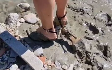 (后续1)新买的可爱凉鞋踩泥弄脏了 在附近的水潭里冲洗一下