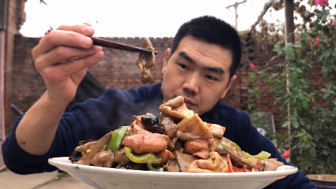 小伙炒了道溜三样来吃,猪肚肥肠搭配吃真不赖,小酒喝上了