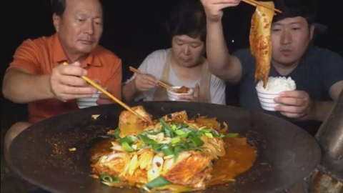 中字:韩国兴森一家人的一顿晚餐:泡菜炖鲭鱼,一家人围着锅吃的美滋滋