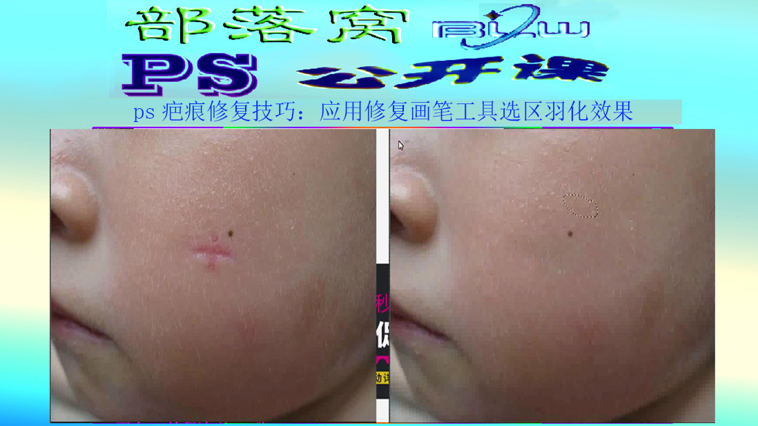 ps疤痕修复技巧视频:ps修复工具应用视频-ps修复画笔工具视频-ps选区羽化效果视频