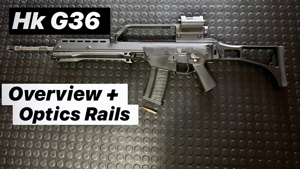 G36没有传统的机械瞄具,整个光学瞄准系统安装在机匣上方是一个“桥”形可兼作提拔的装置。视频中的型号参考了德国国防军的配置,即一个是带特殊分划的3倍瞄准镜,安装在提把的后下方;另一个是1.5倍红点反射式瞄准镜,安装在提把顶部。但这两个瞄具的视场很窄不方便使用,一些部队和特警反而更喜欢G36C和G36KV(挪威版)的带有皮卡汀尼导轨的机械瞄具,以安装性能更好的光学瞄镜。HK也为G36设计了一个可装AR15系步枪弹匣的弹匣插槽模块,使其能通用AR15/M16系列步枪的弹匣和C-MAG双鼓形100发弹匣。