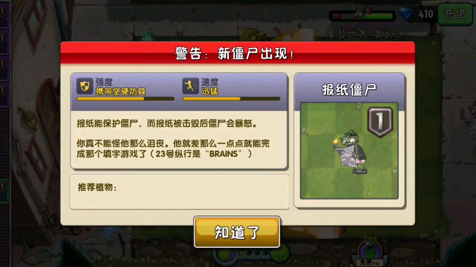植物大战僵尸2:对报纸僵尸有种恐惧感。