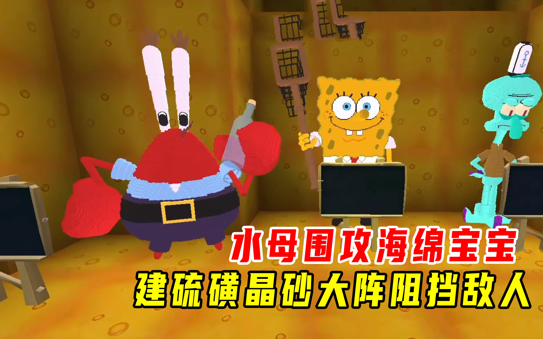 迷你世界:水母围攻海绵宝宝,小宇建硫磺晶砂大阵阻挡敌人