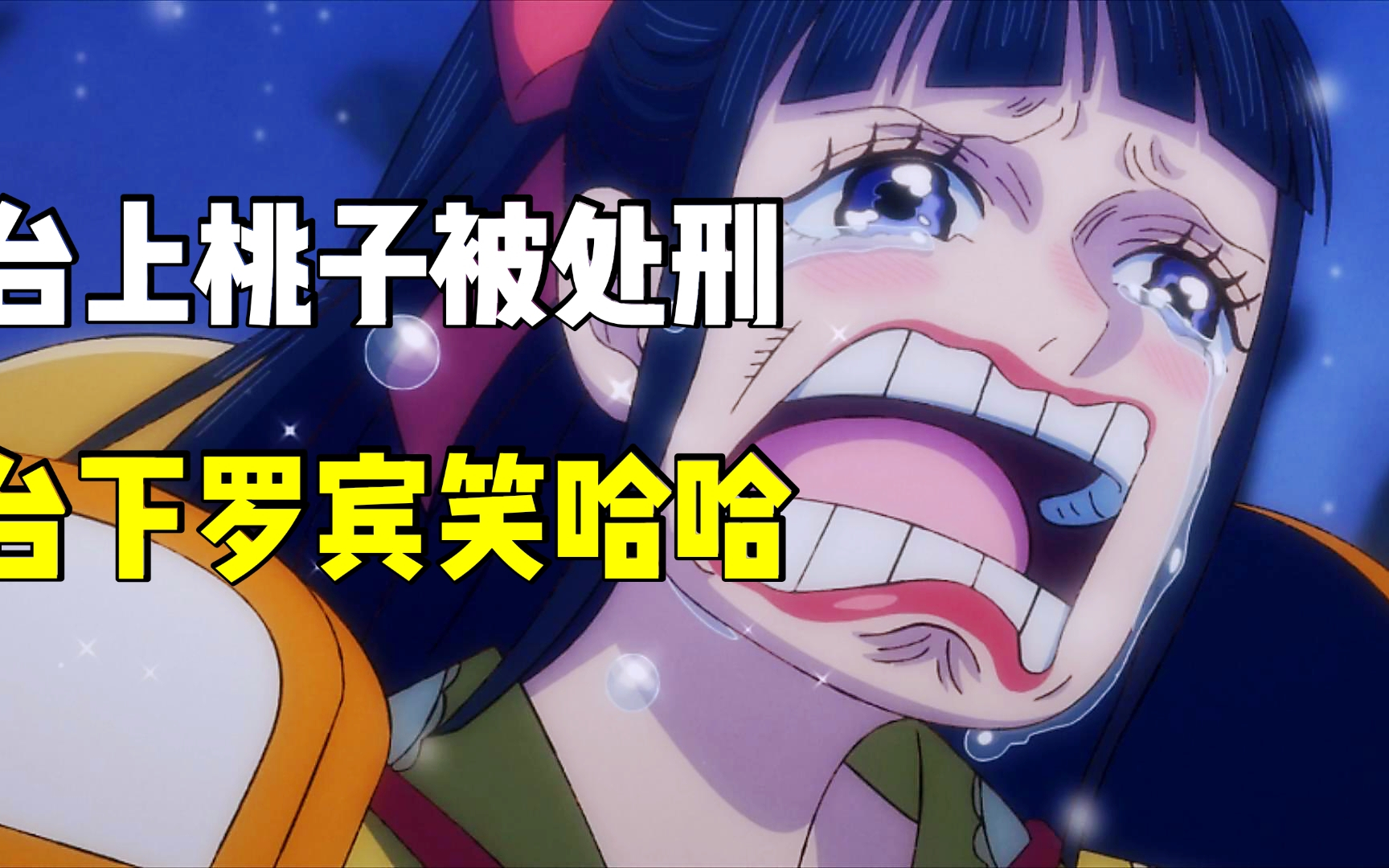 台上桃之助被处刑,台下罗宾哈哈大笑,大和摘面具,路飞呆住了