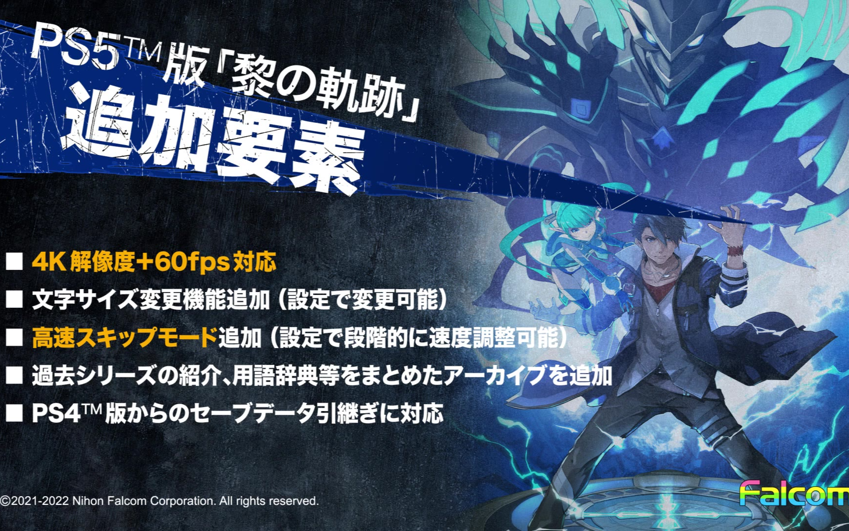PS5版支持4K60fps,追加高速模式和一些DLC,可继承PS4存档数据,详情https://www.falcom.co.jp/archives/36500