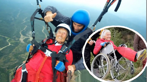 两个外国老奶奶比高空跳伞 中国老奶奶不服也跟着跳