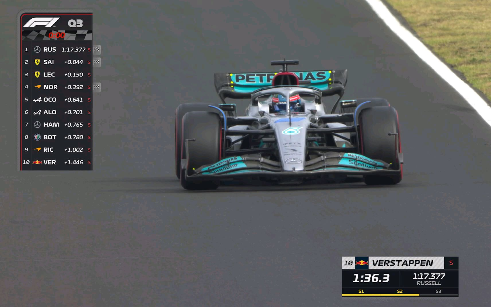 F1 2022匈牙利排位赛,拉塞尔突围成功,拿下人生第一个杆位,赛恩斯第二,勒克莱尔第三