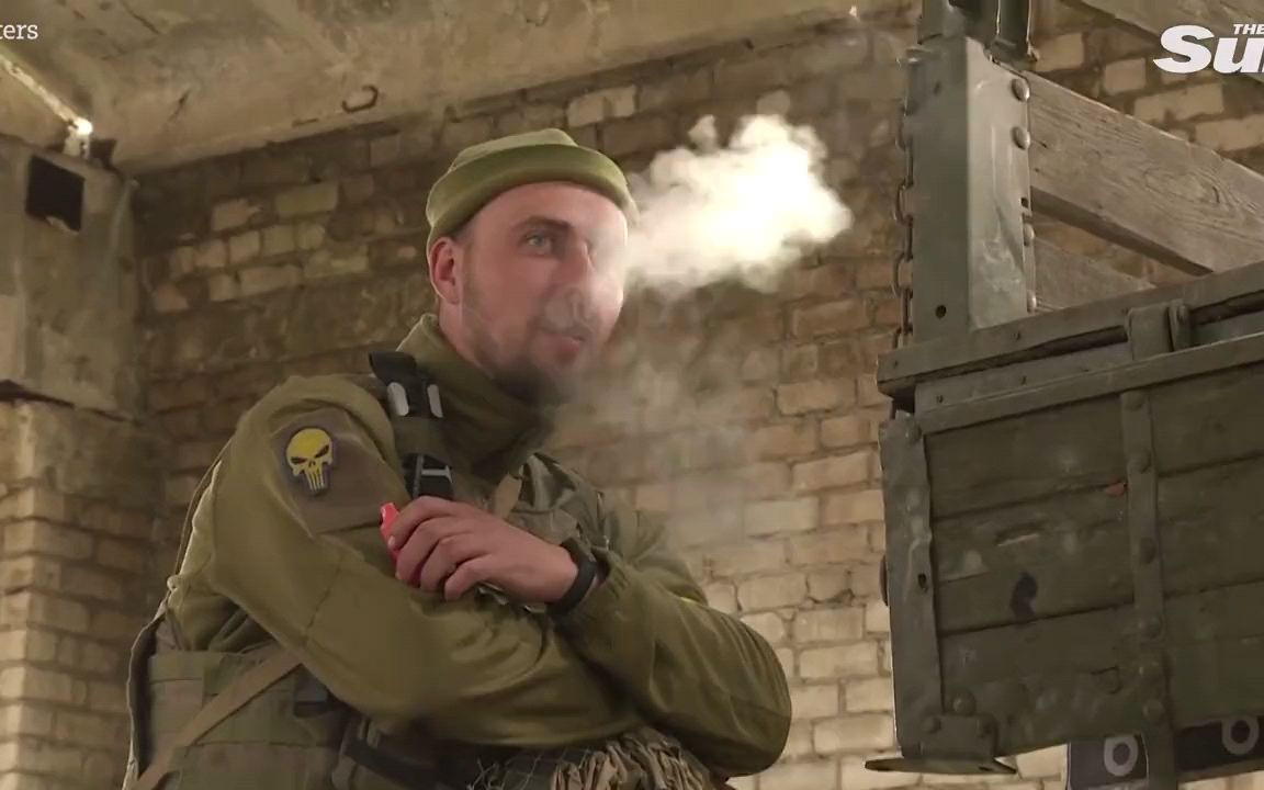 我们看到了一名乌克兰武装部队的士兵,他坐在一个装有香烟的盒子上,据说里面应该装有弹药。