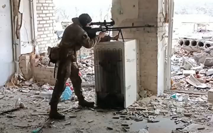 俄罗斯军队的侦察兵使用 KSVK 12.7 毫米反器材狙击步枪对付敌人。