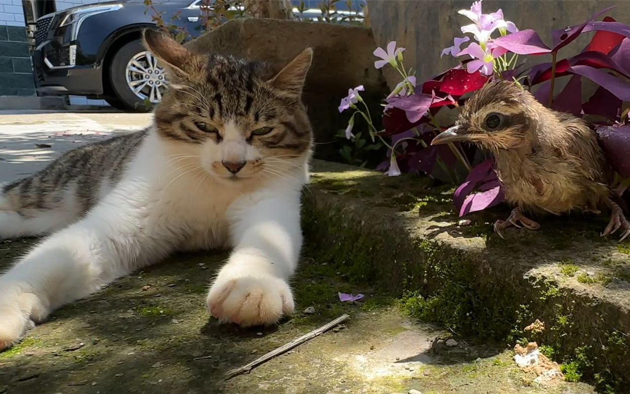 都说猫是鸟的天敌,这鸟站猫嘴边,猫却把它当朋友