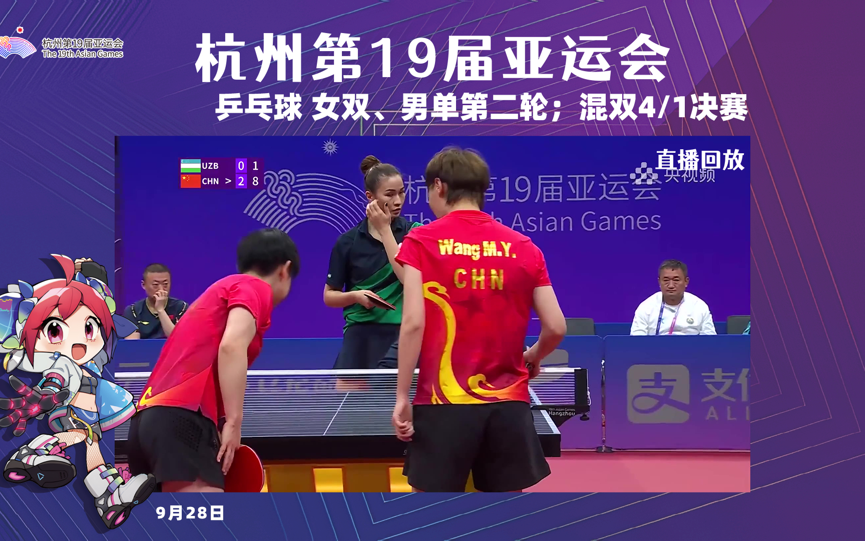 当日,杭州亚运会乒乓球项目女子双打淘汰赛第二轮在杭州举行,中国组合孙颖莎/王曼昱以3比0战胜乌兹别克斯坦组合马尔哈博·马格季耶娃/罗扎林娜·哈吉耶娃,晋级下一轮。