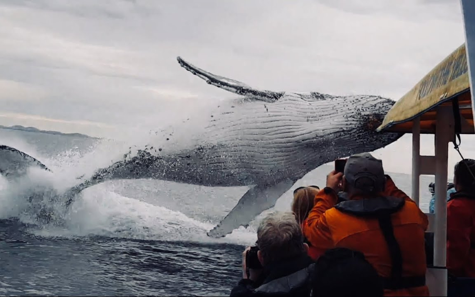 惊险~1只鲸鱼突然跳起吓坏船上的人!
