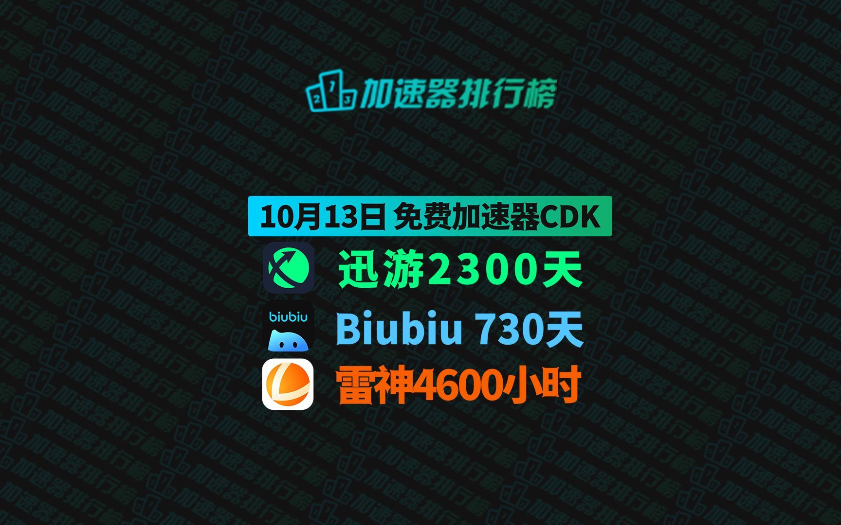 10月13日迅游加速器免费2300天兑换码!biubiu730天兑换码!雷神4600小时!人手一份!先到先得!