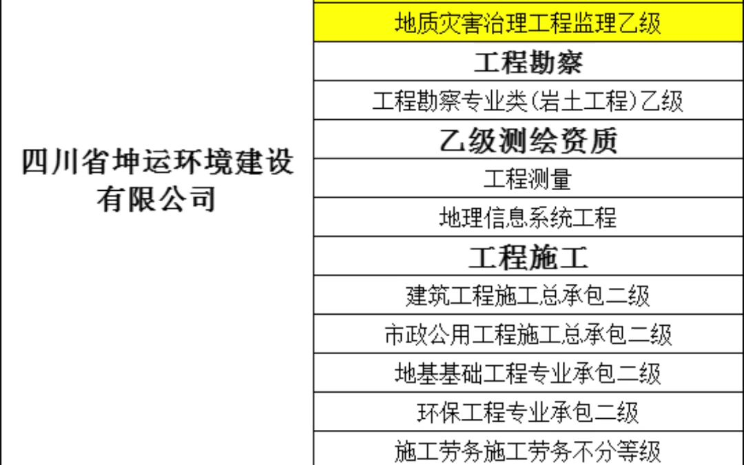 四川省坤运环境建设有限公司,地质灾害评估和治理工程勘察设计甲级,地质灾害治理工程施工甲级,监理乙级,